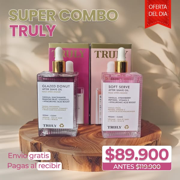 Con la nueva promo COMBO Truly™ ORIGINALES, llévate Soft Serve y Glazed Donut, dos aceites post-afeitado de alta gama, diseñados para calmar, hidratar y dejar tu piel radiante. Dos fórmulas distintas, una experiencia de lujo total: una con fresa y vainilla, otra con maracuyá y coco. ¡Tu piel lo va a agradecer!